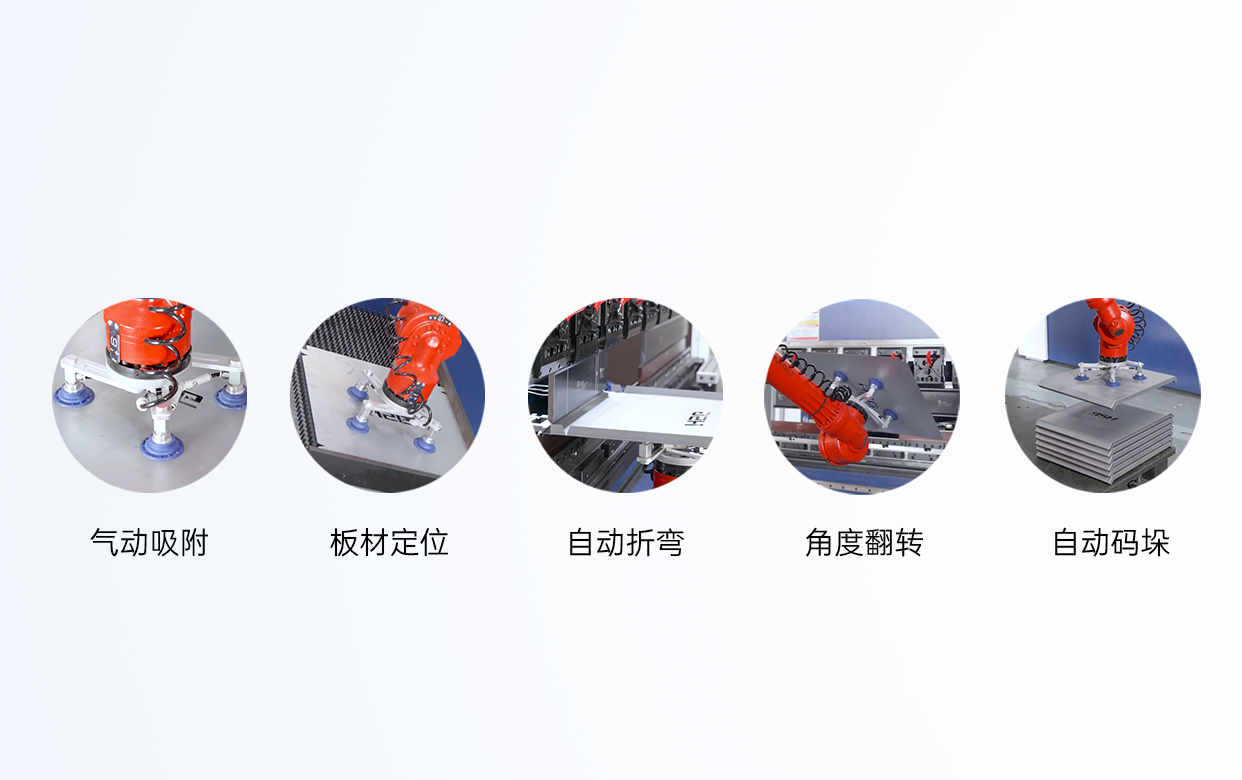 氣動吸附、板材定位、自動折彎、角度翻轉、自動碼垛,所有工序一站式加工。