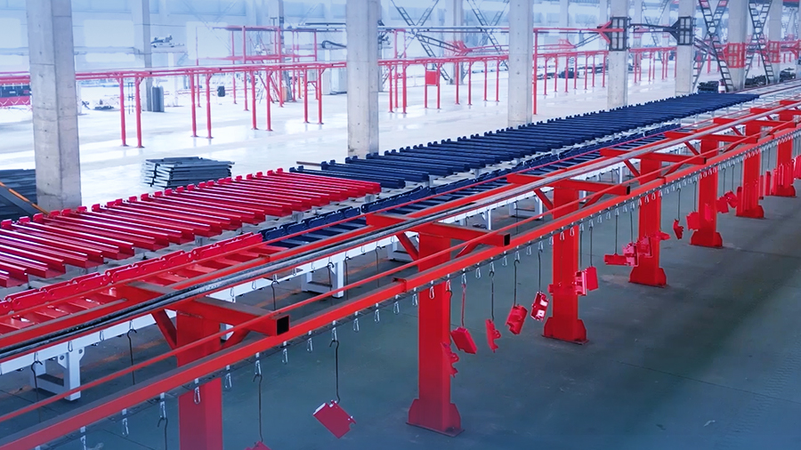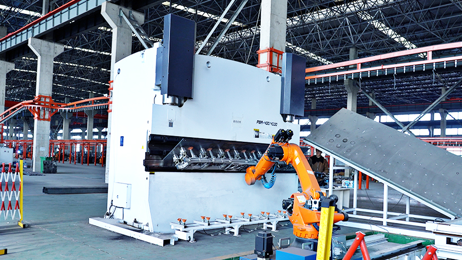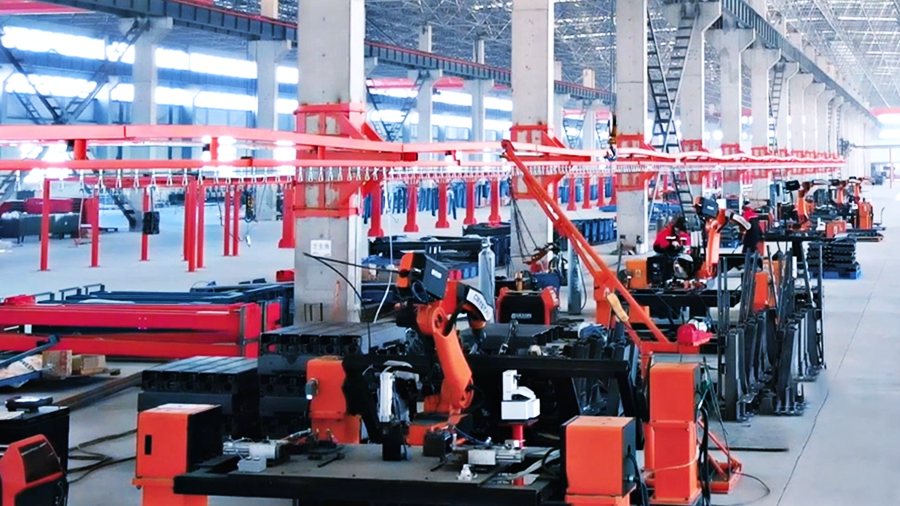 產(chǎn)線上配套國內(nèi)先進的激光切割機,數(shù)控折彎機、庫卡機械手臂,川崎焊接機器人及相應(yīng)配套的四軸、三軸變位機,自動噴涂機器人等智能自動化設(shè)備。”董總帶領(lǐng)宏山銳視角團隊穿行在產(chǎn)線間,各類機器設(shè)備有條不紊地流轉(zhuǎn)、托起、加工、下料;大型零部件在車間內(nèi)歷經(jīng)多道加工,從平面到造型,從裸色到上色。整個車間在極致的有序中,譜寫著年產(chǎn)能30000臺的實績。